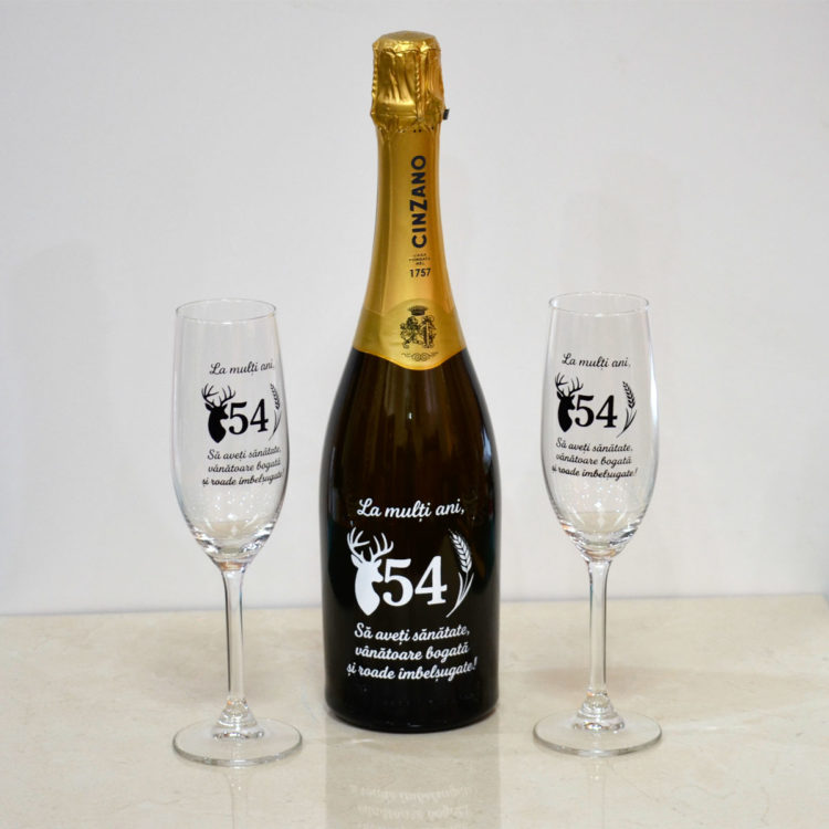Setul contine o sticla de sampanie si doua pahare personalizate cu mesaj si cifra aniversara. Designul poate fi adaptat in functie de varsta sarbatoritului, mesajul dorit sau eveniment.