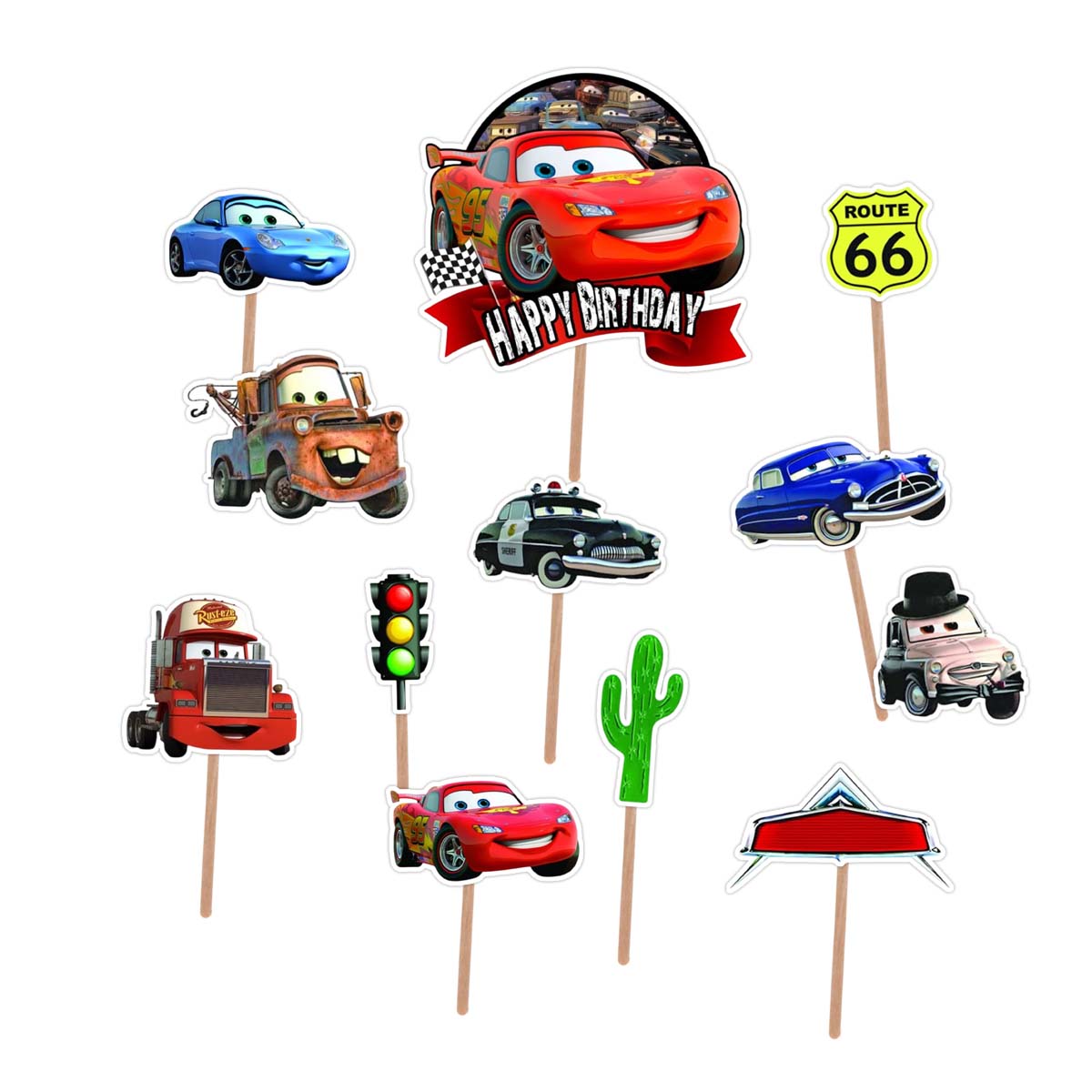 Completeaza decorul petrecerii cu acest set de figurine tort Cars Lightning McQueen, ideal pentru aniversarea unui baiat pasionat de masini si personaje Cars. Setul contine 12 piese decorative montate pe bat din lemn, gata pentru utilizare imediata.