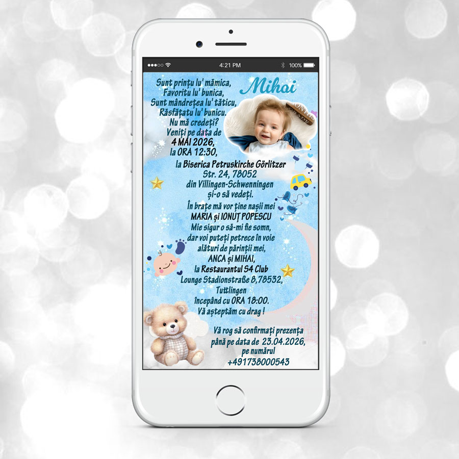 Invitatia de botez electronica personalizata cu ursulet si fotografie este alegerea ideala pentru parintii care isi doresc o solutie moderna, rapida si emotionanta pentru a anunta acest eveniment special. Acest tip de invitatie imbina designul delicat cu functionalitatea digitala, fiind perfecta pentru trimitere prin WhatsApp, email sau retele sociale.