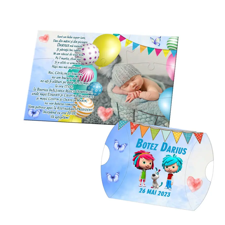 Invitatie puzzle botez sau aniversare, nuanta bleu-albastru