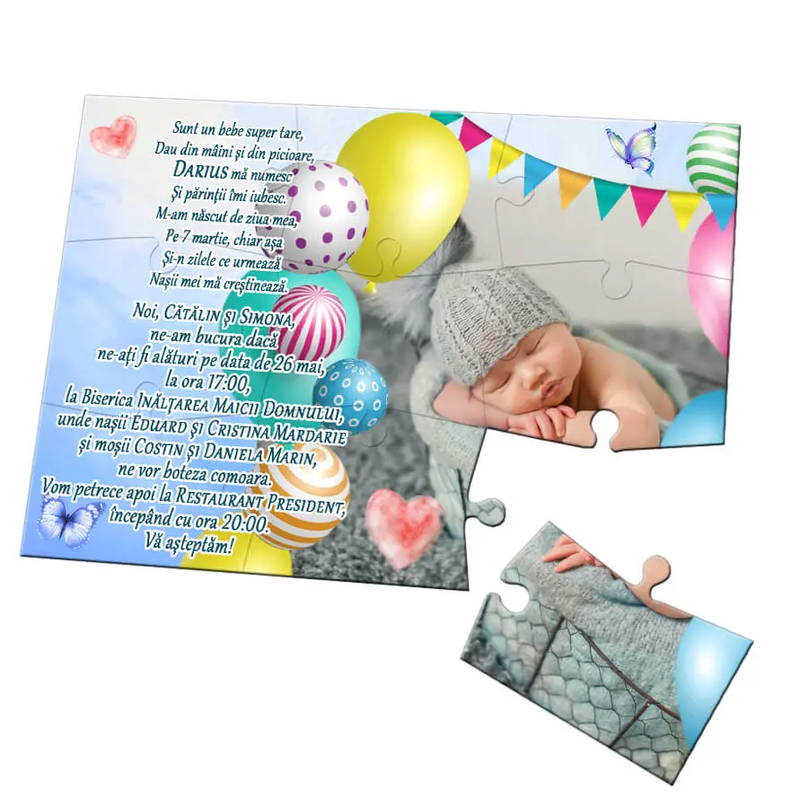 Invitatie tip puzzle din mucava grosime 2 mm.