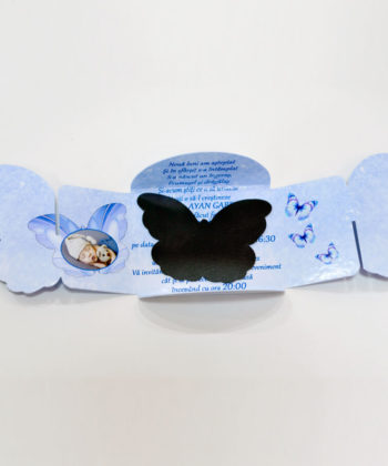 Invitatii botez cutiute cu magneti fluturi, baieti, culoare albastra