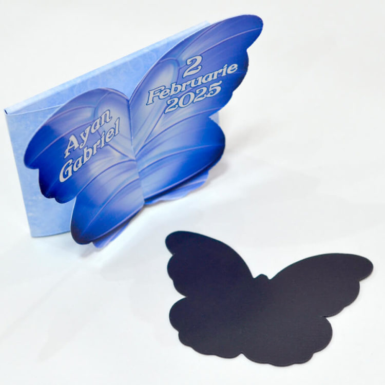 – Cutie pentru magnet, forma fluture personalizata cu textul dorit.