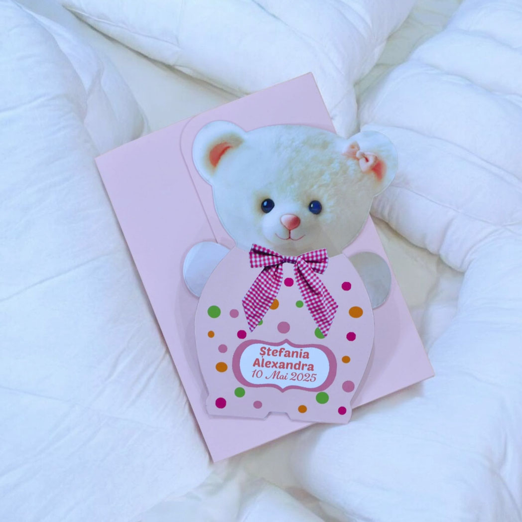 Alege Invitatii Botez Ursulet Fetite Alb-Roz pentru un botez memorabil. Comanda online invitatii de botez personalizate, realizate cu atentie la detalii si livrate rapid oriunde in Romania.