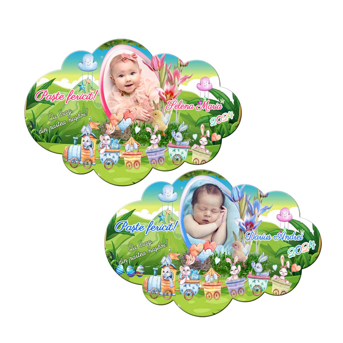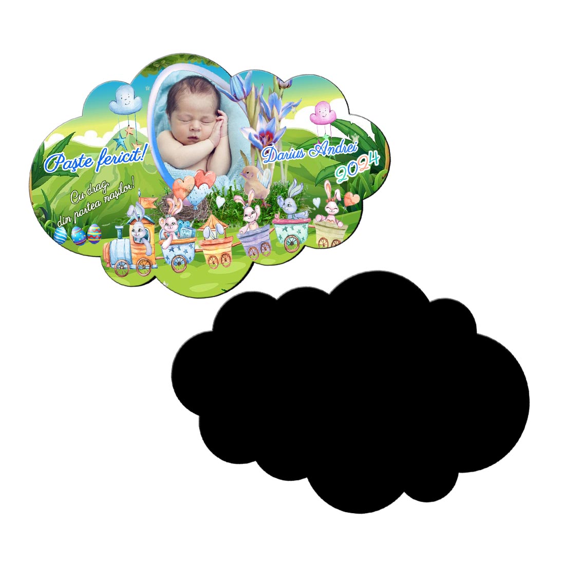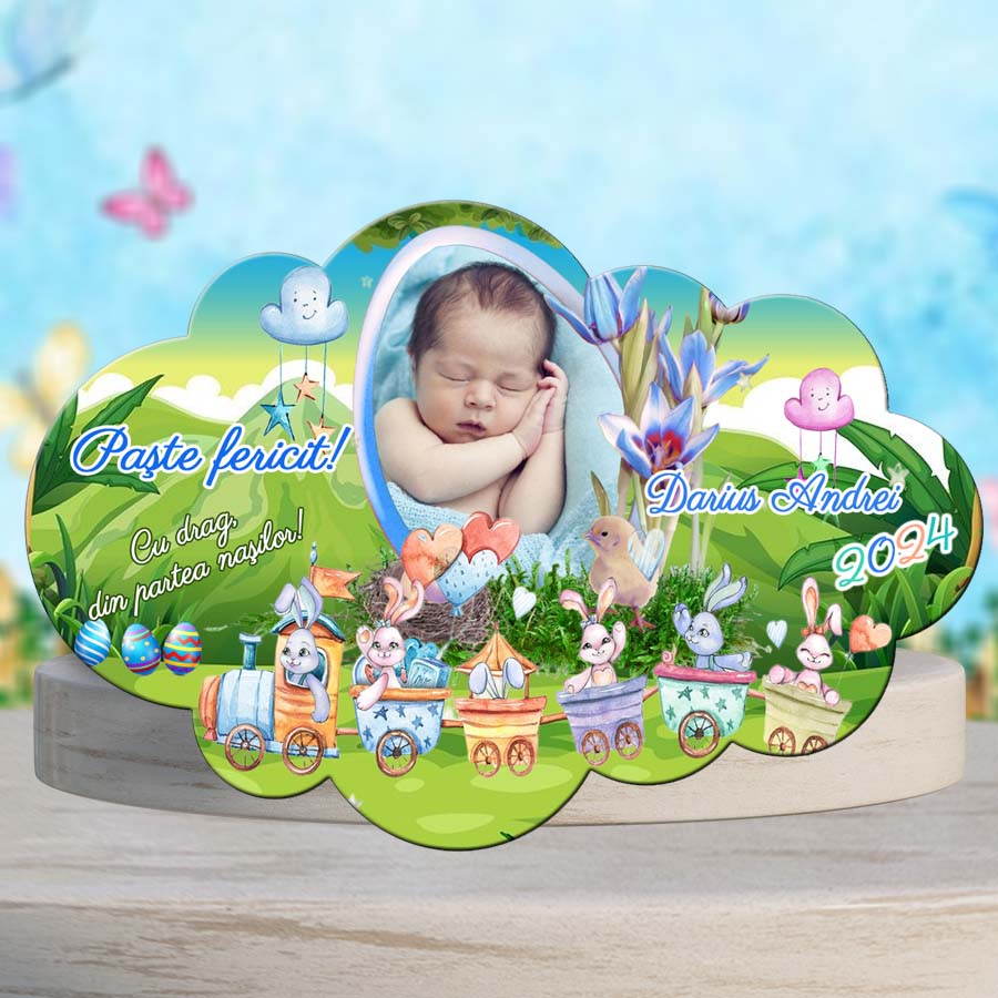 Magnet personalizat de Paste cu poza, forma norisor, tematica vesela de primavara.