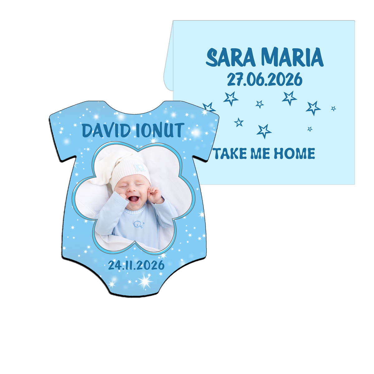 Magneti marturii botez baieti sub forma de magnet tricou personalizat cu poza, nume si data. Design bleu cu stelute, magnet premium plastifiat si plic bleu personalizat inclus, ideal pentru marturii botez baieti.