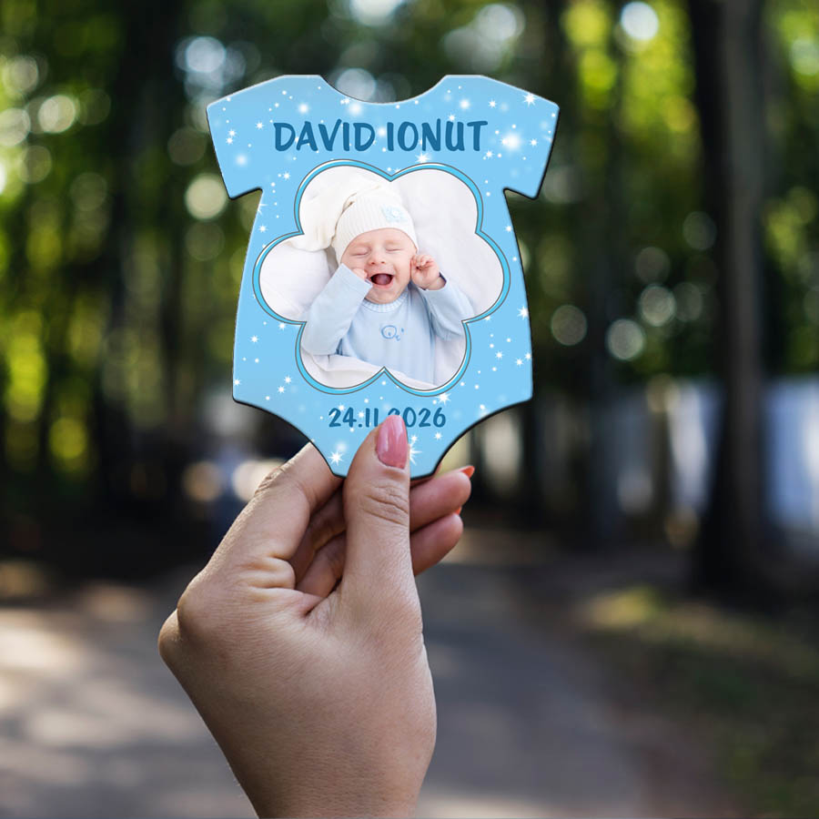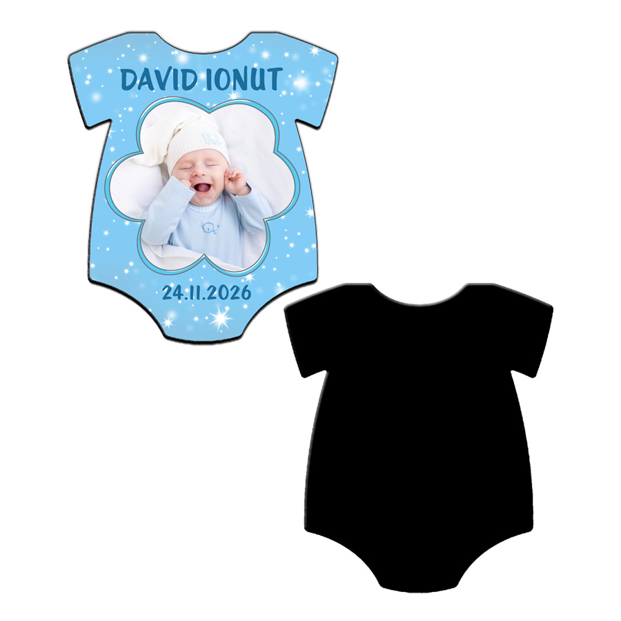 Magneti marturii botez baieti realizati sub forma de magnet tricou (baby body), personalizat cu fotografia bebelusului, numele si data evenimentului. Aceste marturii botez magnet sunt o alegere practica si emotionanta pentru botezul baietelului, oferind invitatilor o amintire de durata.