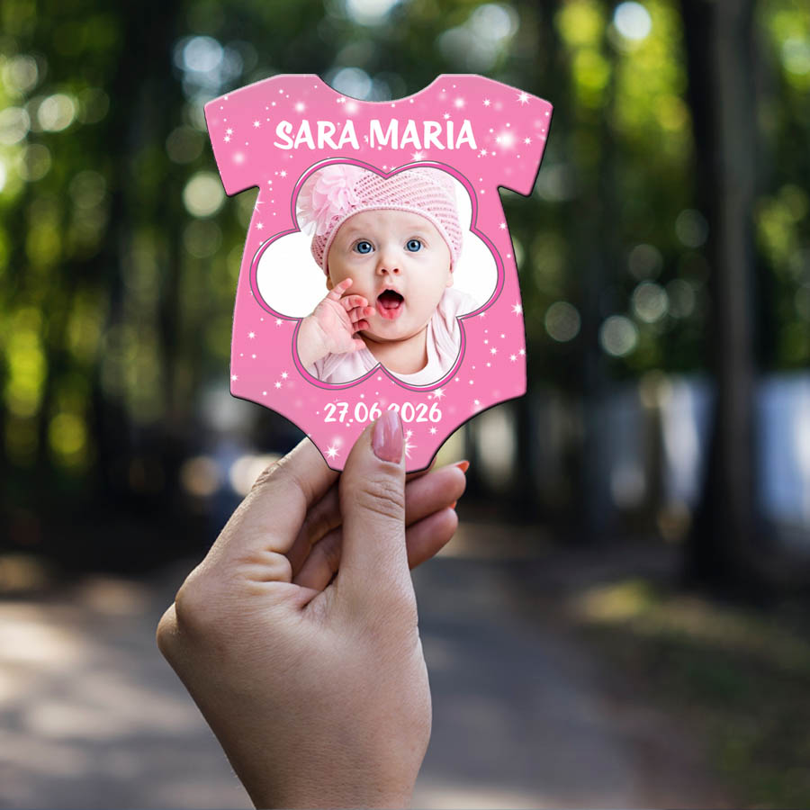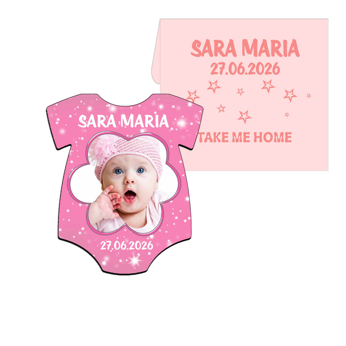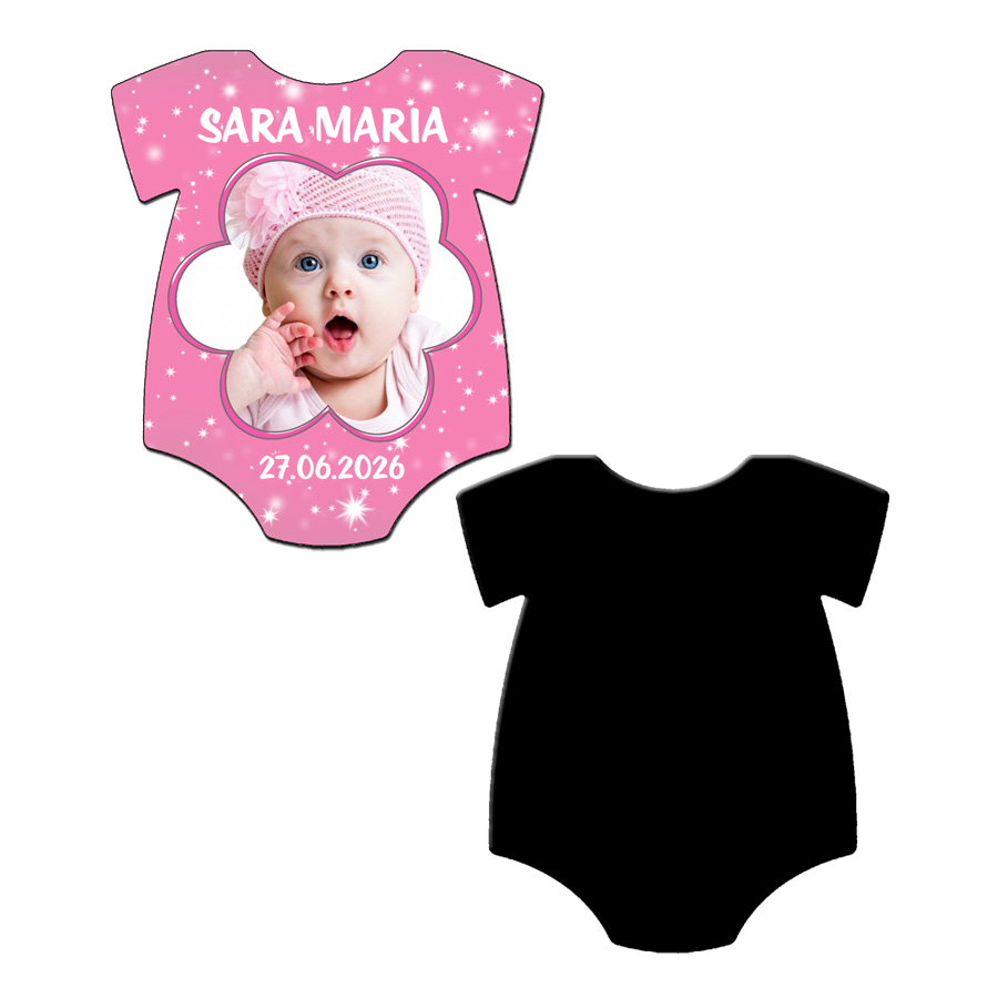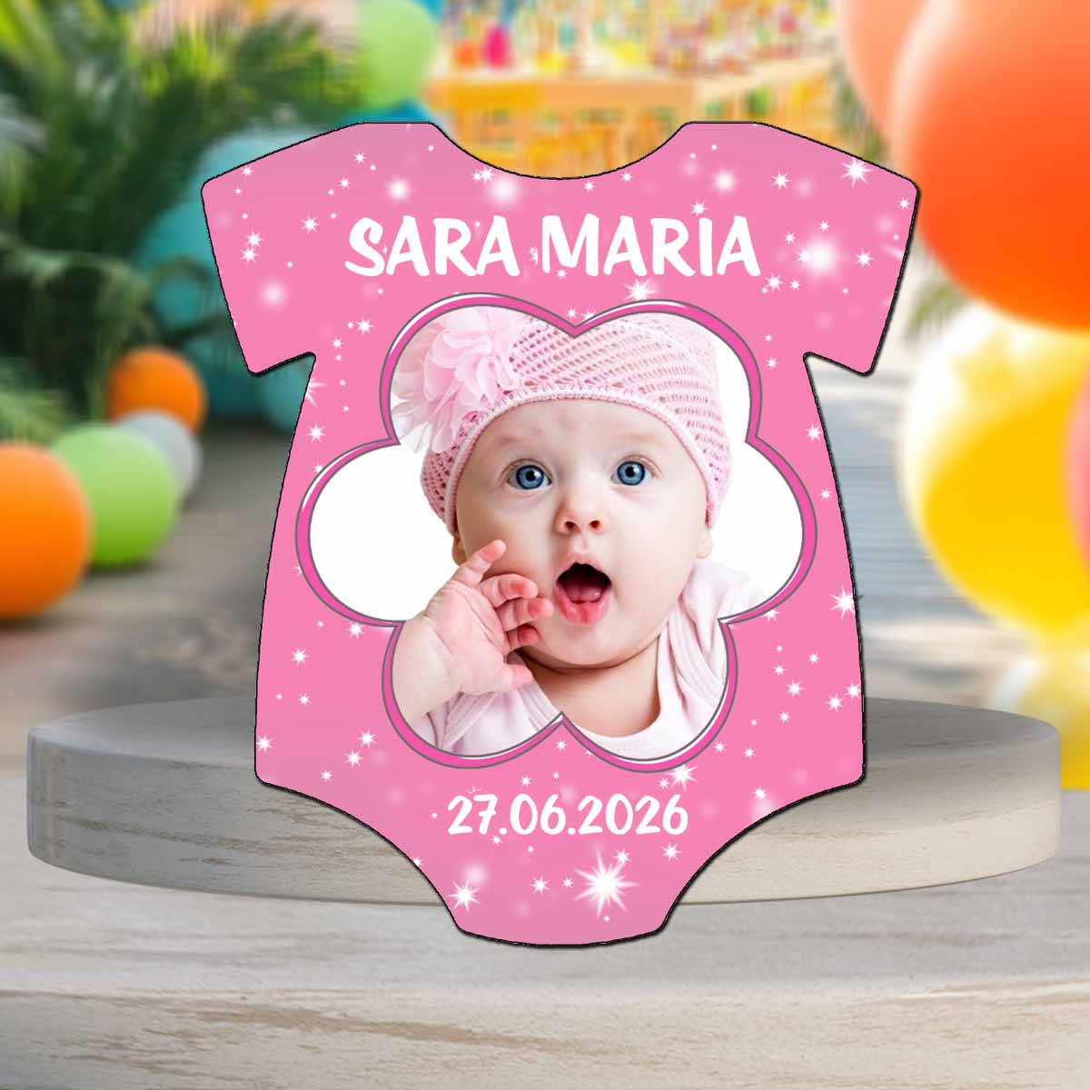 Magneti marturii botez fetite realizati sub forma de magnet tricou (baby body), personalizat cu fotografia bebelusului, numele si data evenimentului. Aceste marturii botez magnet sunt o alegere delicata si practica pentru botezul fetitei tale, oferind invitatilor o amintire frumoasa si durabila.