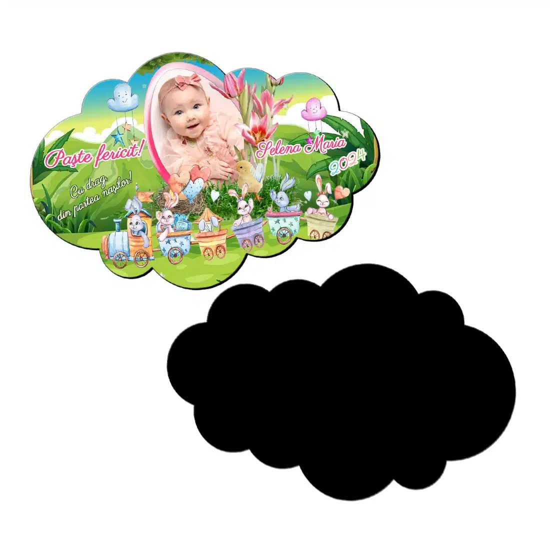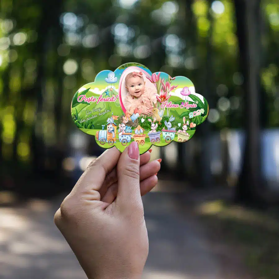• Design tematic: Magnet cu tematica de Paste, decorat cu iepurasi, un trenulet si fotografia bebelusului incadrata intr-un ou roz, inconjurat de flori.