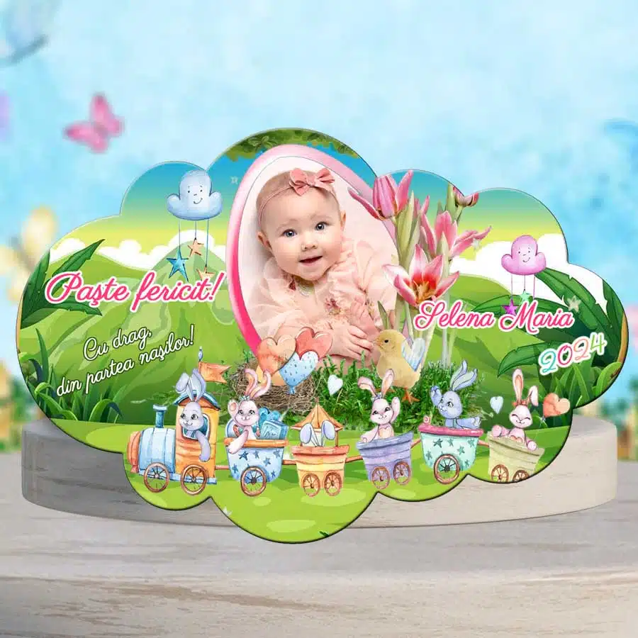 • Personalizare: Include fotografia bebelusului, prenumele si mesajul: „Paste Fericit, Cu drag din partea nasilor.”