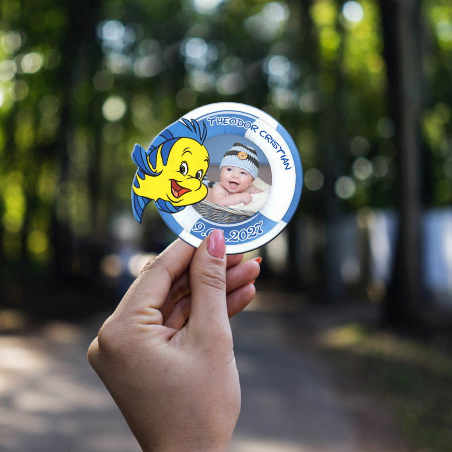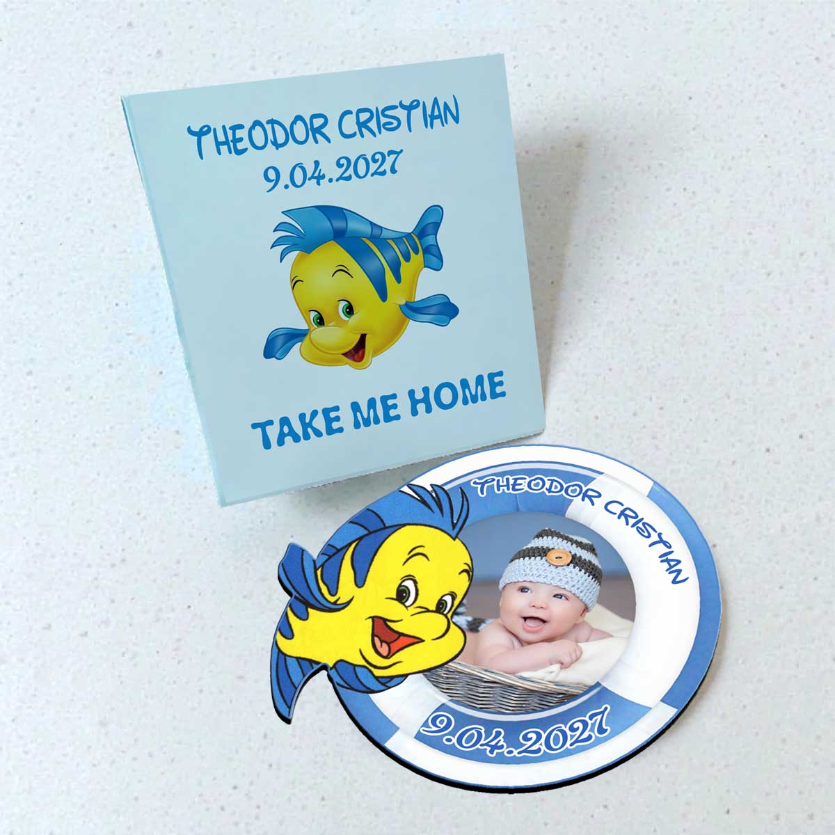 Marturii botez pentru baieti sub forma de magnet pestisor personalizat, realizate din materiale premium si gandite special pentru a oferi invitatilor o amintire simpatica si eleganta de la botez.