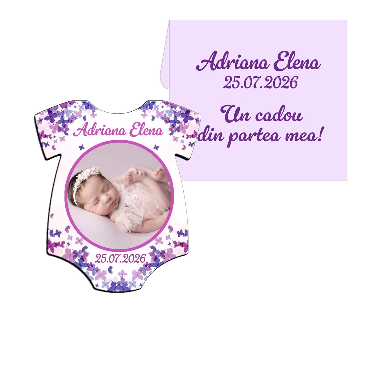 Marturii botez fata magnet tricou personalizat cu poza, nume si data. Design floral mov lila, magnet premium plastifiat si plic lila personalizat inclus, ideal pentru marturii botez fetite elegante.