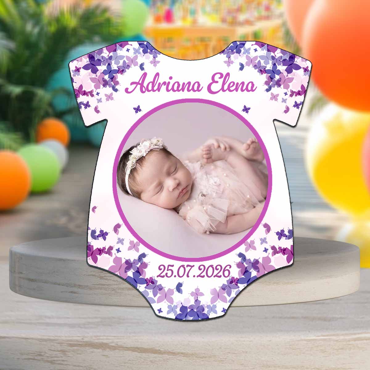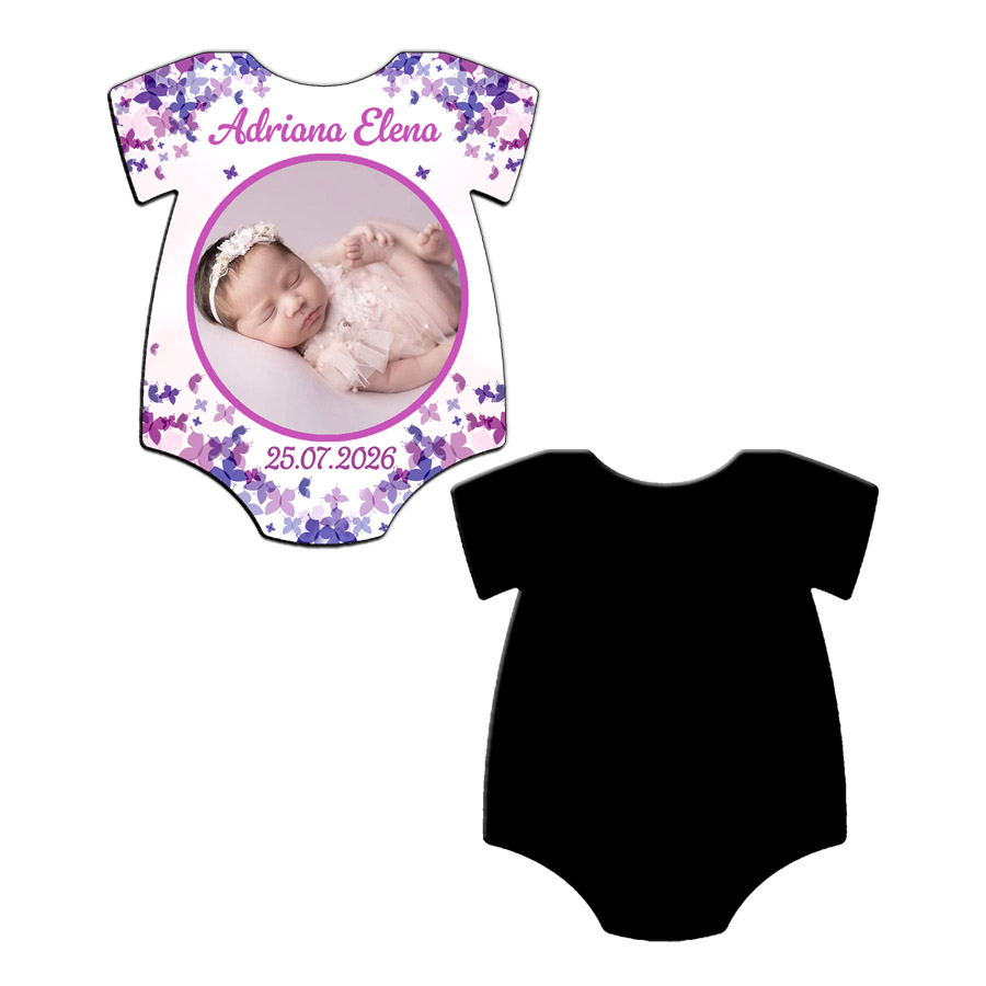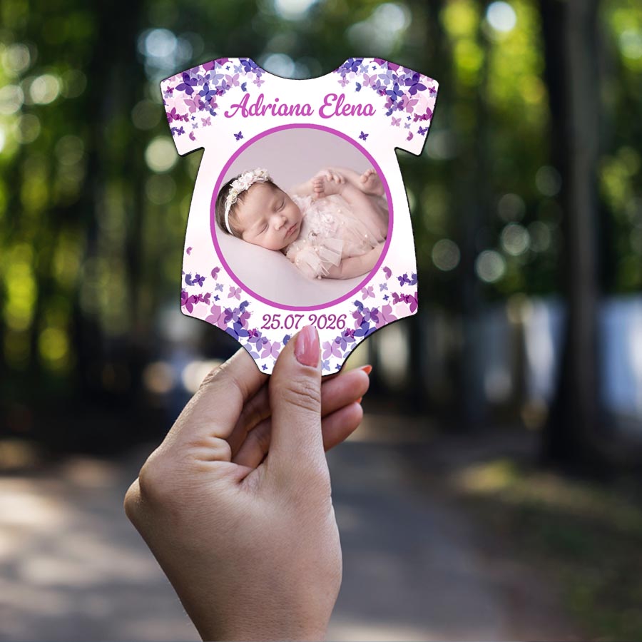 Marturii botez fata realizate sub forma de magnet tricou (baby body), personalizat cu fotografia bebelusului, numele si data evenimentului. Aceste marturii botez magnetice sunt o alegere eleganta si rafinata pentru botezul fetitei tale, oferind invitatilor o amintire speciala.