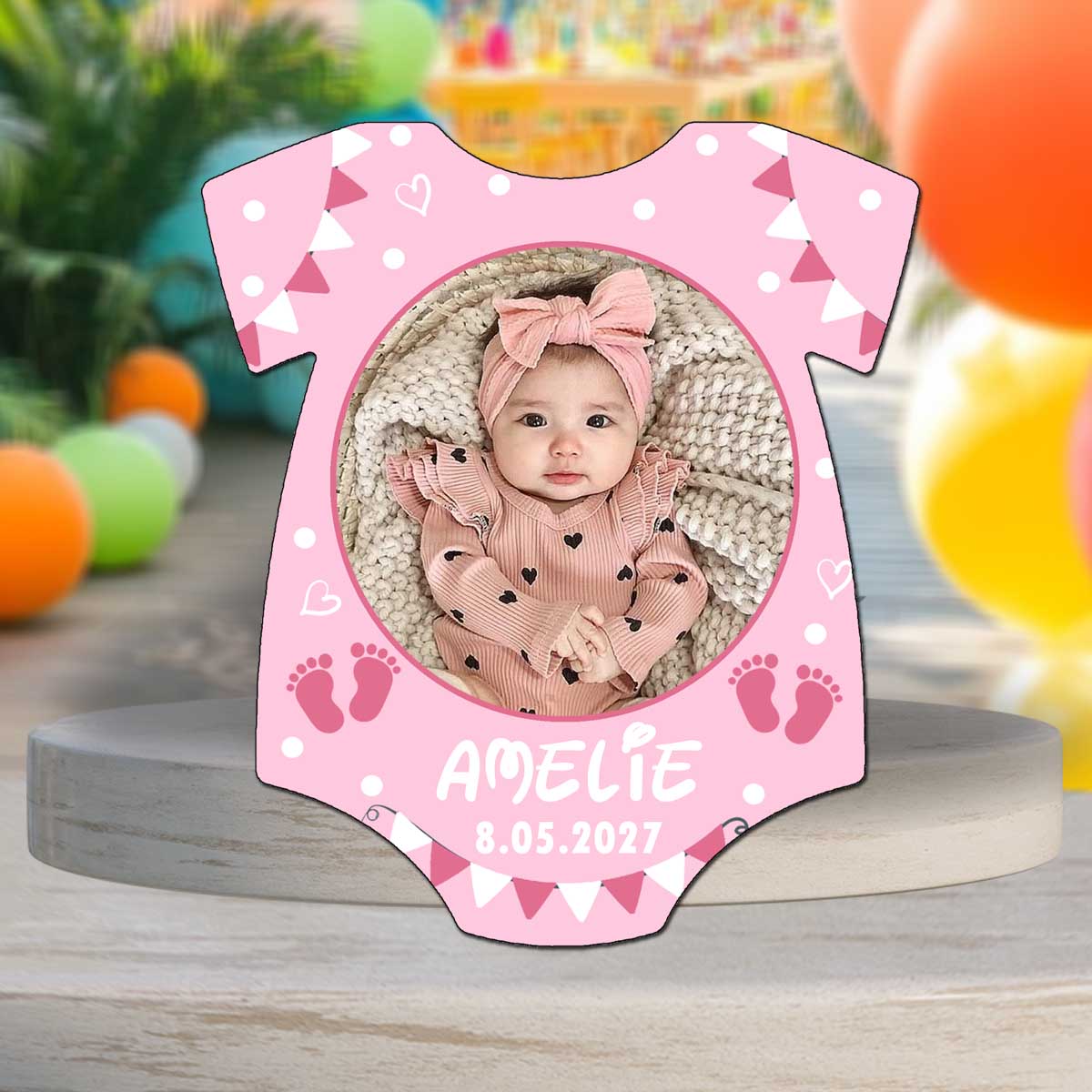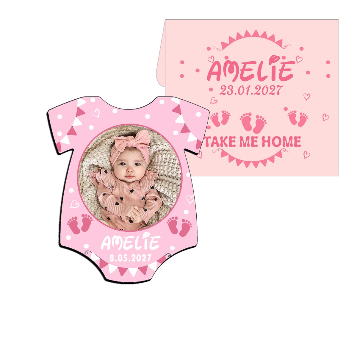Aceste marturii botez fetite magnet tricou roz sunt realizate in forma de body baby si sunt personalizate cu poza, nume si data evenimentului. Magnetul premium si plicul roz personalizat ofera un suvenir elegant si util.
