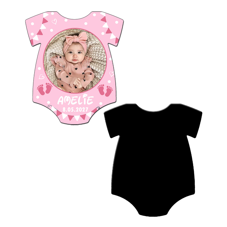 Marturii botez fetite magnet tricou roz personalizate cu poza, nume si data. Magnet premium forma body baby cu plic roz inclus.