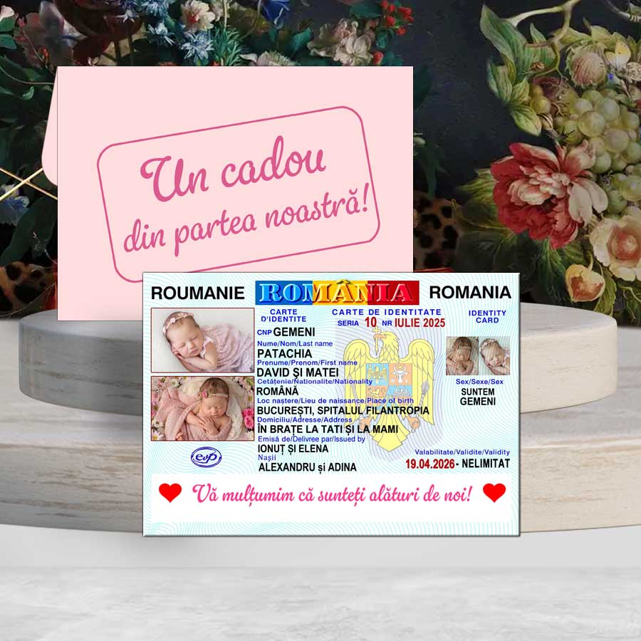 Marturii botez gemeni fetite magneti buletin personalizati cu doua poze, livrati in plicuri roz personalizate. Magnet premium plastifiat, ideal pentru botez gemeni fetite.