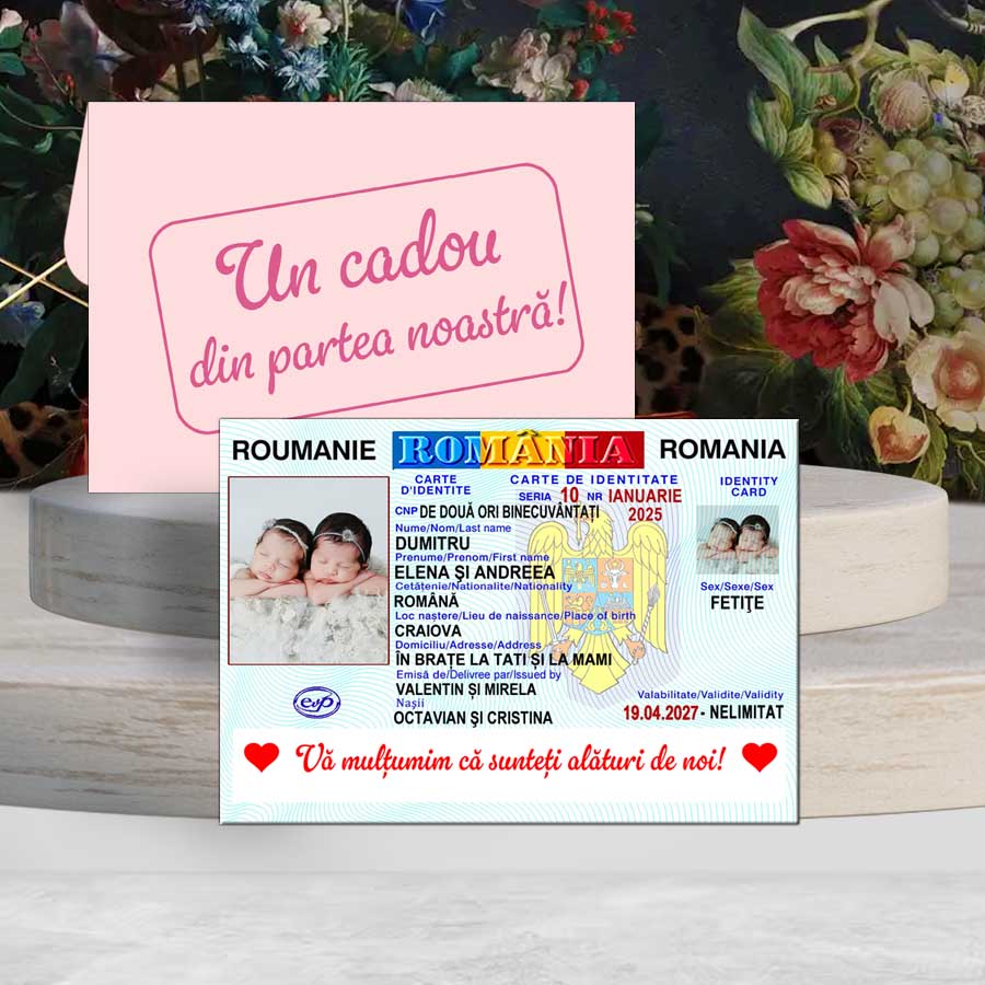 Marturii botez gemeni fetite magneti buletin personalizati cu o poza, livrati in plicuri personalizate. Magnet premium plastifiat, ideal pentru botez gemeni fetite.