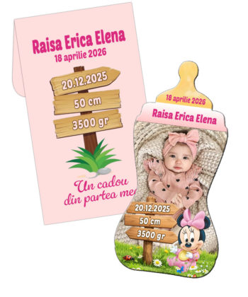 Pentru text, completati prenumele bebelusului si data evenimentului sau data nasterii.
