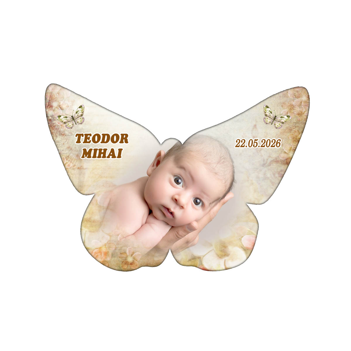 Marturie botez magnet fluture personalizat cu poza bebelusului, fundal vintage