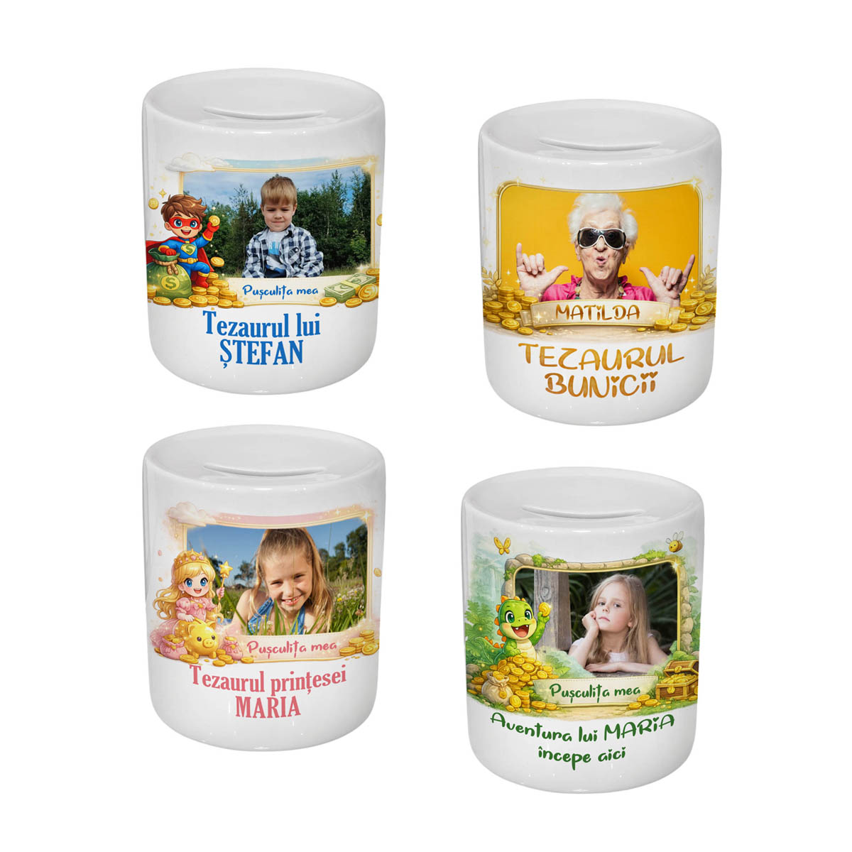 Pusculita personalizata cu poza si text, realizata din ceramica, ideala pentru copii sau cadou special pentru familie. Alege unul dintre cele 4 modele grafice si transforma o simpla pusculita intr-un cadou unic si memorabil.
