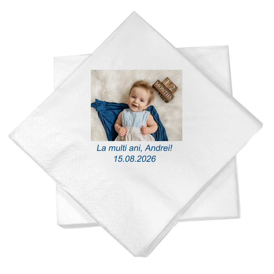 servetel personalizat pentru aniversare cu poza color si textServetel personalizat dedicat aniversarilor, realizat pe servetel alb din hartie, cu personalizare color. Printul include fotografia color si textul dorit, pozitionate intr-o singura zona a servetelului.