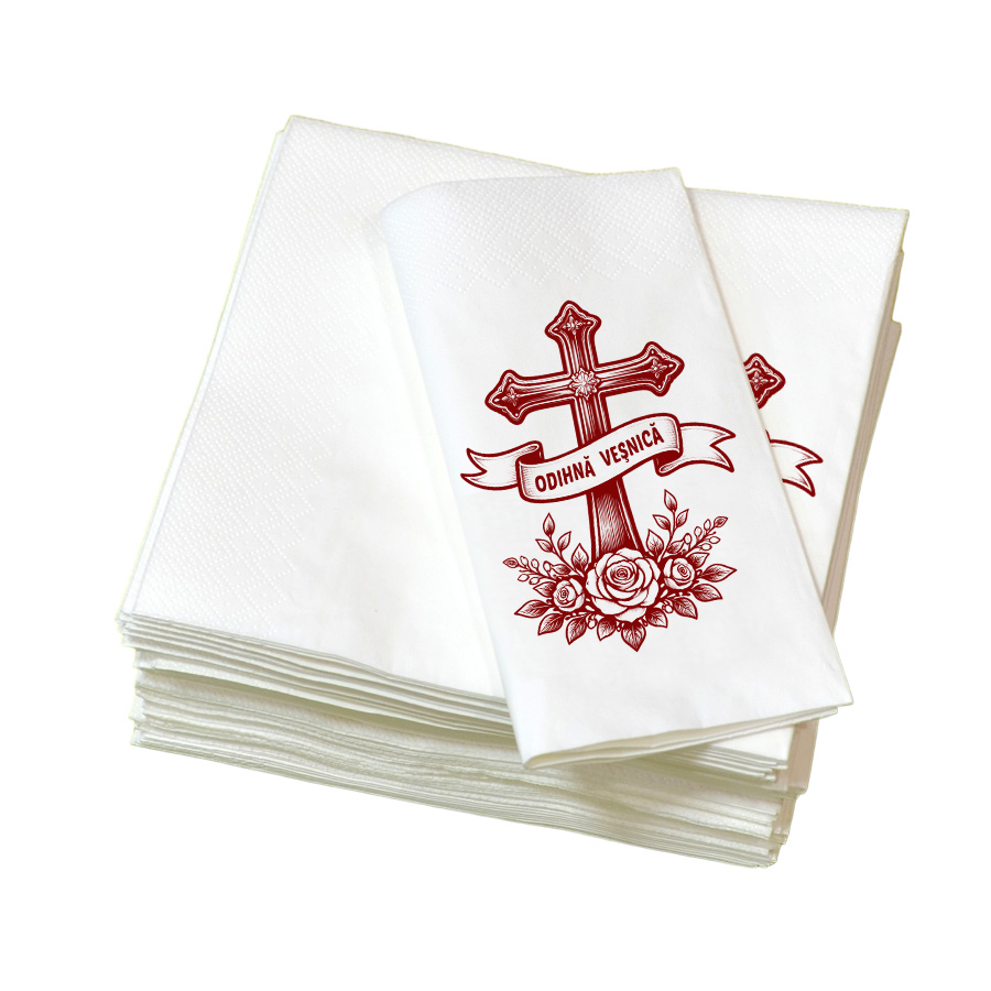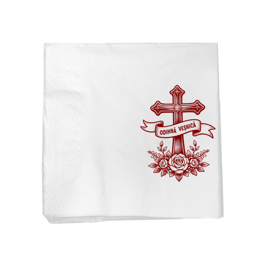servetele parastas alb cu model floral si cruce grena odihna vesnicaAceste servetele pentru parastas imbina eleganta unui design floral cu simbolul crestin al crucii, oferind un produs potrivit pentru momente de comemorare si reculegere. Imprimarea in nuanta grena adauga un aspect cald si rafinat.