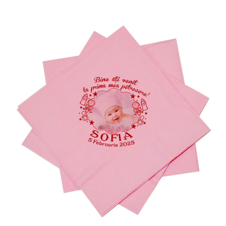 Servetelele sunt personalizate cu fotografia bebelusului, prenumele si data evenimentului.
