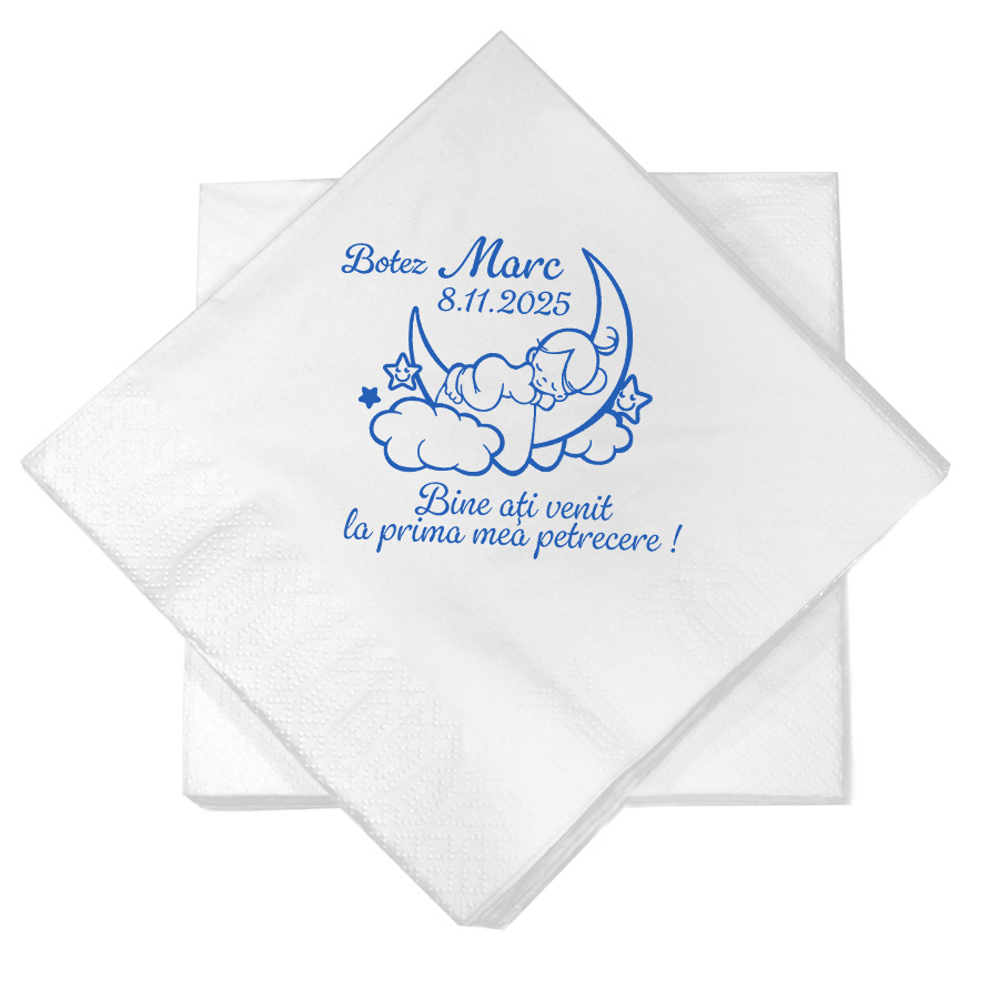 Servetelele sunt personalizate cu prenumele bebelusului si data evenimentului.